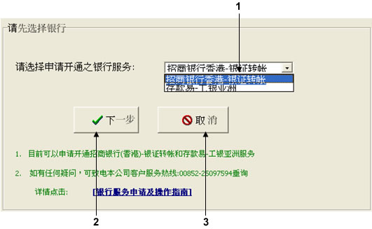 1:选择将要开通的银行服务,现阶段已开通:招商银行香港-银证转帐 及存款易-工银亚洲