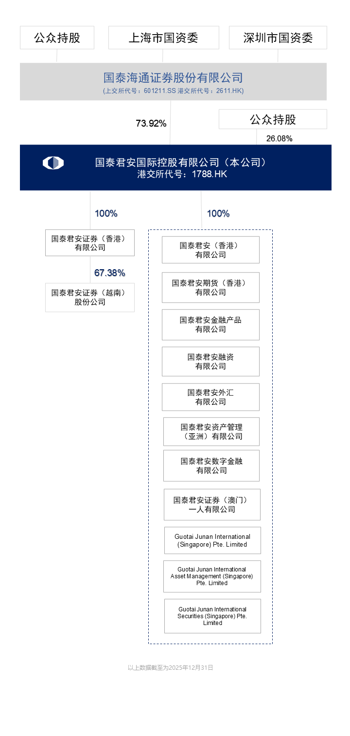 公司控股股东国泰海通证券股份有限公司(股票代号601211.SH/股票代号2611.HK)为中国最大证券公司之一。凭借母公司强劲经营支持,国泰君安国际锐意开拓并深化香港及亚太市场,成为区内拥有市场影响力的重要证券金融机构。